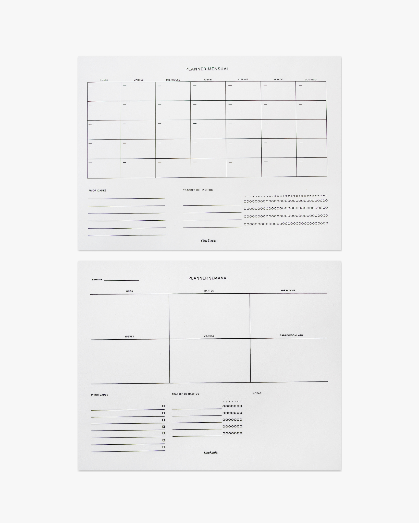 El Pack de Productividad Semanal y Mensual es la herramienta perfecta para planificar con visión y detalle. Con el planner mensual, visualizarás tus objetivos y compromisos de un solo vistazo, mientras que el planner semanal te permitirá estructurar tus días con más precisión, asegurando equilibrio entre tareas, bienestar y tiempo personal. Diseñados para potenciar tu productividad sin estrés, estos planners te ayudarán a gestionar mejor tu tiempo y enfocarte en lo que realmente importa.